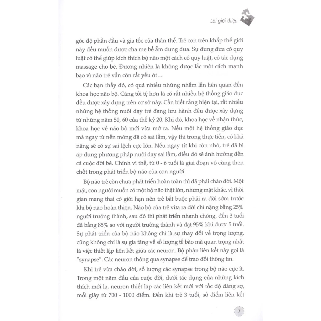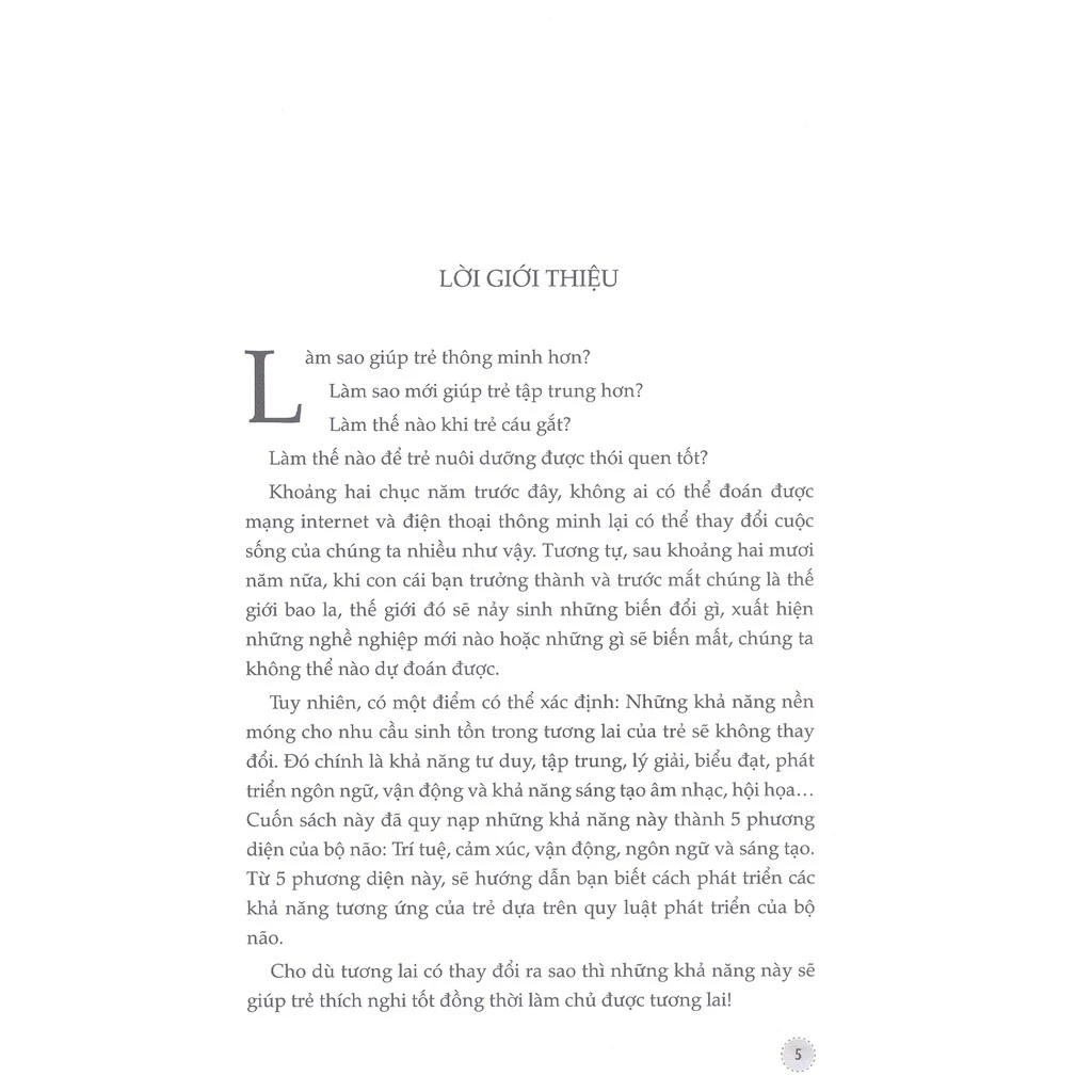 Tuy nhiên, có một điểm có thể xác định: Những khả năng nền móng cho nhu cầu sinh tồn trong tương lai của trẻ sẽ không thay đổi. Đó chính là khả năng tư duy, tập trung, lý giải, biểu đạt, phát triển ngôn ngữ, vận động và khả năng sáng tạo âm nhạc, hội họ Cuốn sách này đã quy nạp những khả năng này thành 5 phương diện của bộ não: Trí tuệ, cảm xúc, vận động, ngôn ngữ và sáng tạo. Từ trên 5 phương diện này, cuốn sách sẽ hướng dẫn bạn biết cách phát triển các khả năng tương ứng của trẻ dựa trên quy luật phát triển của bộ não.